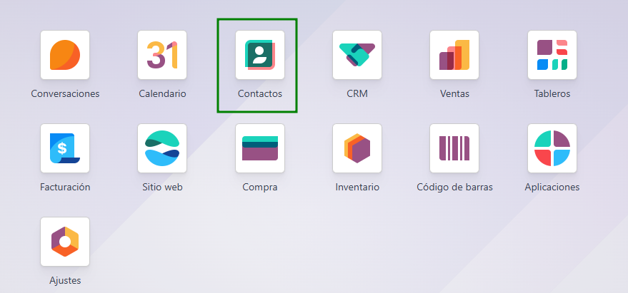- 1.- Desde el tablero principal de Odoo, haz clic en el módulo "Contactos".